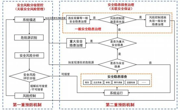 如發(fā)現(xiàn)重大安全隱患,應(yīng)按照8.3的要求進行治理;如發(fā)現(xiàn)一般安全隱患,應(yīng)當按照8.4的要求進行治理;排查中如發(fā)現(xiàn)潛在的危險源,應(yīng)回溯到“7.2系統(tǒng)描述”進行定位和梳理,適時啟動安全風(fēng)險分級管控流程識別危險源并管控相關(guān)風(fēng)險;如評估發(fā)現(xiàn)的問題不屬于上述任何一類,可選擇是否改進后,回到系統(tǒng)運行環(huán)節(jié)。