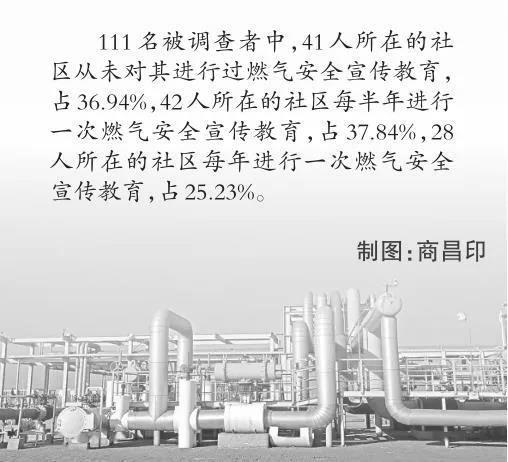 這一點(diǎn),從記者的問卷調(diào)查結(jié)果中也得到了印證。111名被調(diào)查者中,41人所在的社區(qū)從未進(jìn)行過燃?xì)獍踩麄鹘逃?,?6.94%,42人所在的社區(qū)每半年進(jìn)行一次燃?xì)獍踩麄鹘逃?7.84%,28人所在的社區(qū)每年進(jìn)行一次燃?xì)獍踩麄鹘逃?,?5.23%。