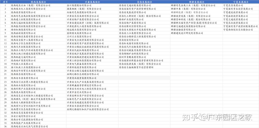 西北5省分別為陜西、甘肅、寧夏、新疆和青海。西北5省共擁有103家省級國企,其中陜西數(shù)量最多36家、甘肅31家、青海19家、新疆9家、寧夏8家。