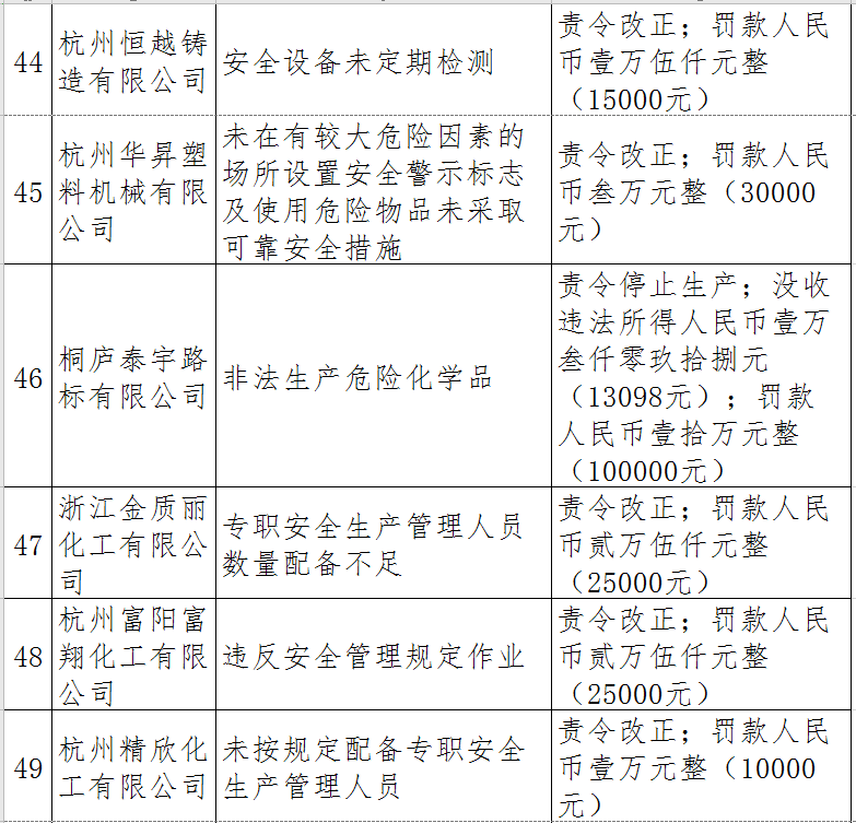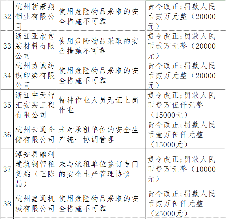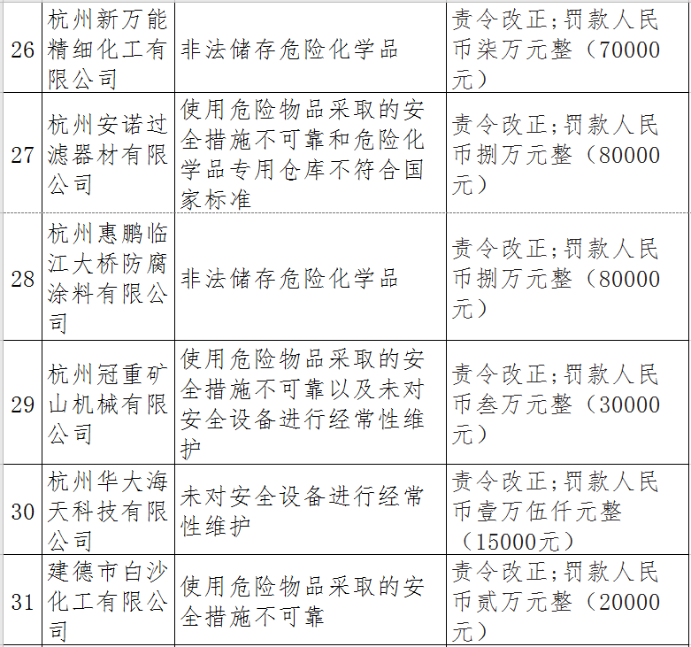 據(jù)了解,今年上半年,杭州市應(yīng)急管理局一手抓駐企復(fù)工復(fù)產(chǎn)、一手抓安全生產(chǎn),已完成年度執(zhí)法計(jì)劃、專項(xiàng)檢查、聯(lián)合執(zhí)法、信訪舉報(bào)核查等,并對(duì)檢查中發(fā)現(xiàn)的安全生產(chǎn)違法違規(guī)企業(yè)(個(gè)人)進(jìn)行了處罰?,F(xiàn)對(duì)52家被行政處罰的企業(yè)(個(gè)人)進(jìn)行曝光,希望各企業(yè)引以為戒!