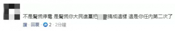 也有網(wǎng)友怒斥民進(jìn)黨當(dāng)局:不是驚慌停電,是驚慌你民進(jìn)黨把臺(tái)灣搞成這樣,這是你任內(nèi)第二次了?!?/p>
