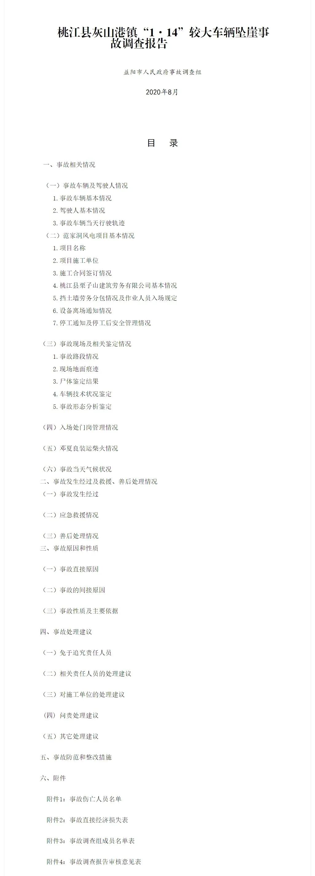 9月18日,湖南益陽市應(yīng)急管理局發(fā)布桃江縣灰山港鎮(zhèn)“1·14”較大車輛墜崖事故調(diào)查報(bào)告。事故為2020年1月14日17時(shí)10分許,在桃江縣灰山港鎮(zhèn)范家洞風(fēng)電項(xiàng)目場內(nèi)道路5-1#主干道18#機(jī)位處發(fā)生一起車輛墜崖事故,導(dǎo)致5人死亡,車輛受損報(bào)廢,直接經(jīng)濟(jì)損失約528萬元。報(bào)告原文如下: