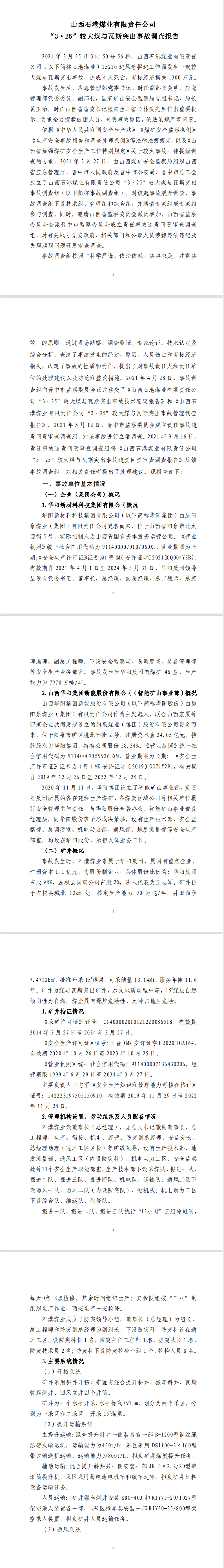 2021年3月25日,山西華陽集團石港煤業(yè)有限公司(以下簡稱石港煤業(yè))15210進風巷掘進工作面發(fā)生煤與瓦斯突出事故,突出煤(矸)量為244t、瓦斯量為22882m3,造成4人死亡,直接經濟損失1300萬元,事故后遲報。