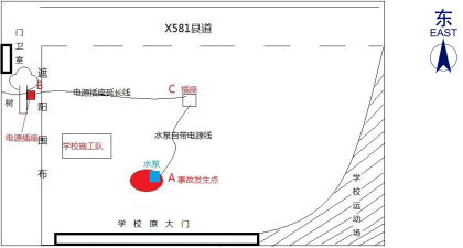 約9時(shí),馮建威先到達(dá)現(xiàn)場查看情況,協(xié)調(diào)借用抽水泵和處理其他維修點(diǎn)工作。隨后,薛柏林、趙文輝駕駛工程車到達(dá)耕管村附近,將一些工具和材料送給附屬施工隊(duì)【1】后,約9時(shí)20分到達(dá)該爆水管處。兩人經(jīng)商量決定先抽走水坑里的水再檢查和維修水管。薛柏林駕駛工程車向附近(約500米外)作業(yè)的附屬施工隊(duì)借回一臺潛水泵(規(guī)格為3寸220V)和一根普通電源插座延長線,回來后將潛水泵放進(jìn)水坑中。趙文輝和薛柏林向?qū)W校維修項(xiàng)目工地(靠學(xué)校操場跑道側(cè))借用臨時(shí)用電,將連接潛水泵的電源插座延長線插在工地施工用的排插上,啟動后發(fā)現(xiàn)潛水泵不運(yùn)行,兩人徒手搖晃潛水泵并調(diào)整插頭,發(fā)現(xiàn)潛水泵仍不運(yùn)行。經(jīng)詢問現(xiàn)場施工人員及剛好經(jīng)過的學(xué)校保安林建軍,得知樹下還有一處借電點(diǎn),保安林建軍未經(jīng)請示校領(lǐng)導(dǎo)同意擅自協(xié)助兩人將電源插座延長線直接插到樹上排插上,此時(shí)潛水泵還是不運(yùn)作,趙文輝和薛柏林懷疑潛水泵可能有故障或者是有雜物堵塞。約9時(shí)45分,趙文輝走向C處查看插頭是否松動時(shí),薛柏林則用雙手徒手檢查潛水泵故障,不慎發(fā)生觸電。此時(shí),馮建威已回來在一旁與上橫中心小學(xué)的張志老師交談,突然聽到薛柏林發(fā)出“觸電”的叫聲,隨即跌倒在地,雙腳落入水坑中。趙文輝立馬拔掉潛水泵自帶電源線的插頭,薛柏林掙扎爬到水坑邊臉朝下趴在地上,臉色發(fā)白,處于昏迷狀態(tài)。