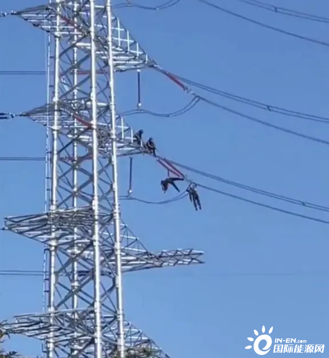 網(wǎng)友拍攝的視頻內(nèi)容顯示,在一道路附近的高壓線桿上,兩名人員的身體懸掛在線纜上一動(dòng)不動(dòng),疑似發(fā)生觸電事故,一旁則是架設(shè)的高壓電力設(shè)施。極目新聞?dòng)浾咦⒁獾?,兩名人員身穿黑色衣服,頭戴安全帽,因事發(fā)地位于道路交叉口,附近來(lái)往行人和車輛較多,不時(shí)有市民在一旁圍觀。