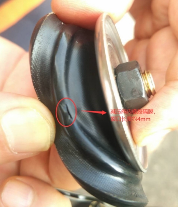 14、氣化器系統(tǒng)(含氣化器出口減壓閥)氣密性試驗(yàn)情況:經(jīng)淮南市特種設(shè)備監(jiān)督檢驗(yàn)中心安全閥校驗(yàn)站使用0.5MPa壓縮空氣對氣化器系統(tǒng)進(jìn)行氣密性試驗(yàn),發(fā)現(xiàn)減壓中間頸部呼吸孔處泄露,后拆解減壓閥,發(fā)現(xiàn)該減壓閥內(nèi)橡膠隔膜破損,高壓側(cè)氣體直接通過破損的橡膠隔膜排出。