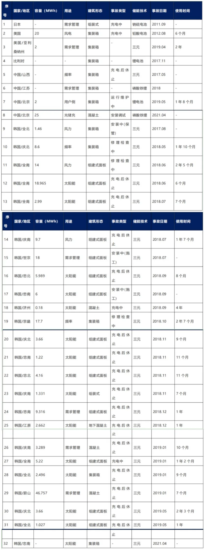 近10年間,全球共發(fā)生32起儲(chǔ)能電站起火爆炸事故。其中,日本1起、美國(guó)2起、比利時(shí)1起、中國(guó)3起、韓國(guó)24起。通過(guò)對(duì)行業(yè)公開(kāi)信息進(jìn)行搜集整理,匯總了2011-2021年間,全球儲(chǔ)能項(xiàng)目主要火災(zāi)或爆炸事故。由于較多安全事故原因復(fù)雜,相關(guān)事件很多都未公開(kāi)披露。