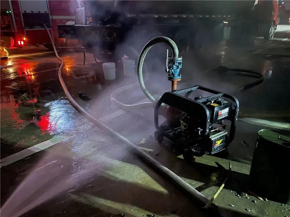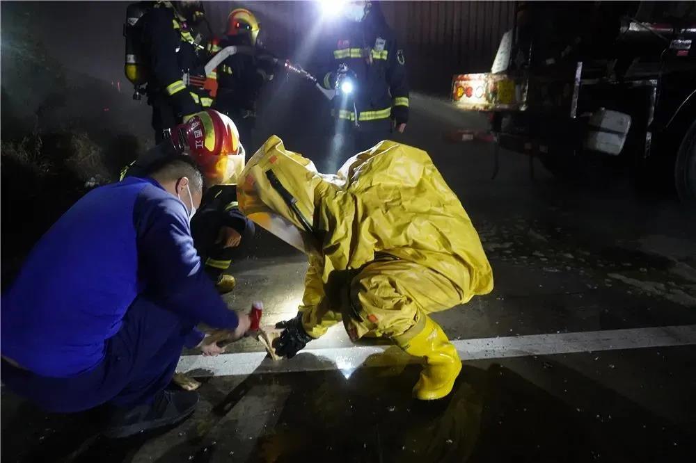 與此同時(shí),戰(zhàn)斗員穿戴好防化服,在水槍的掩護(hù)下帶著無火花快速堵漏器材靠近閥門實(shí)施堵漏作業(yè)。經(jīng)過47分鐘的努力,22時(shí)30分,堵漏成功,隨后前方指揮部安排儲罐車對泄露鹽酸車輛進(jìn)行倒罐處置。